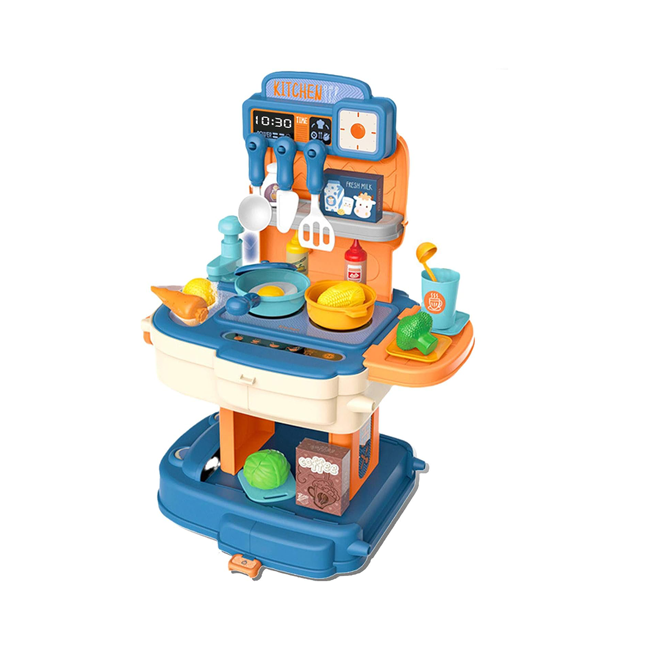 مطبخ محاكاة: 34 ملحق محاكاة، مجموعة متنوعة من أدوات المطبخ، المواقد والأحواض، والأرفف وغيرها من أدوات المطبخ، بالإضافة إلى أدوات الطبخ مثل الخضروات والفواكه وصلصة الصويا، التي يمكنها تطوير إدراك الأطفال للطعام اليومي، يمكنها محاكاة واستعادة مشاهد الطبخ في الحياة. يمكنك أيضًا الضغط يدويًا لجعل الصنبور المحاكي لتفريغ الماء، كما أن حوض غسيل الخضروات له وظيفة توزيع المياه يدويًا.