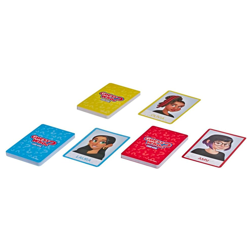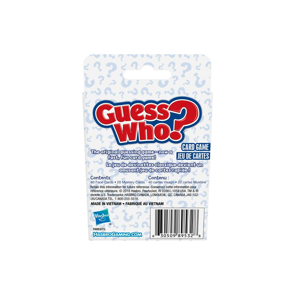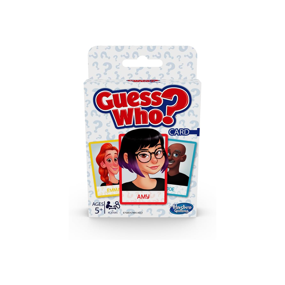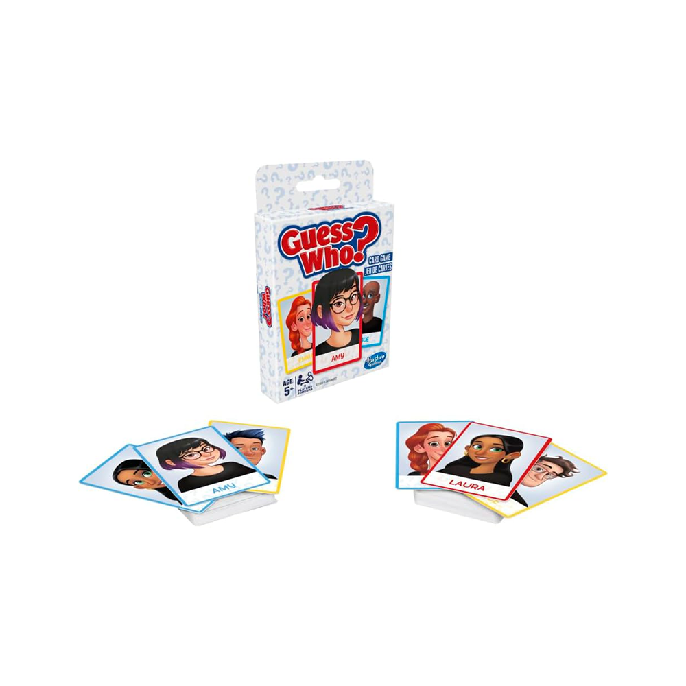إنها نسخة مُبتكرة من لعبة “خمن من؟” باستخدام البطاقات! في هذه النسخة من لعبة “خمن من؟”، يضع اللاعبون بطاقات شخصياتهم أمامهم ويختارون شخصية غامضة من مجموعة البطاقات الغامضة. ثم يسأل كل لاعب خصمه سؤالاً بنعم أو لا، والإجابة تُقرّبه من هو اللاعب الموجود على بطاقة خصمه الغامضة. عندما يعتقد اللاعبون أنهم يعرفون شخصية خصمهم الغامضة، يُخمّنون. التخمين الصحيح يجعل هذا اللاعب فائزًا. إذا كان التخمين خاطئًا، يخسر هذا اللاعب اللعبة! لعبة البطاقات سريعة اللعب هذه هي طريقة مريحة للسماح لأطفالك بأخذ لعبة “خمن من؟” معهم عند السفر أو زيارة منزل صديق. هاسبرو للألعاب وجميع المصطلحات ذات الصلة هي علامات تجارية لشركة هاسبرو.