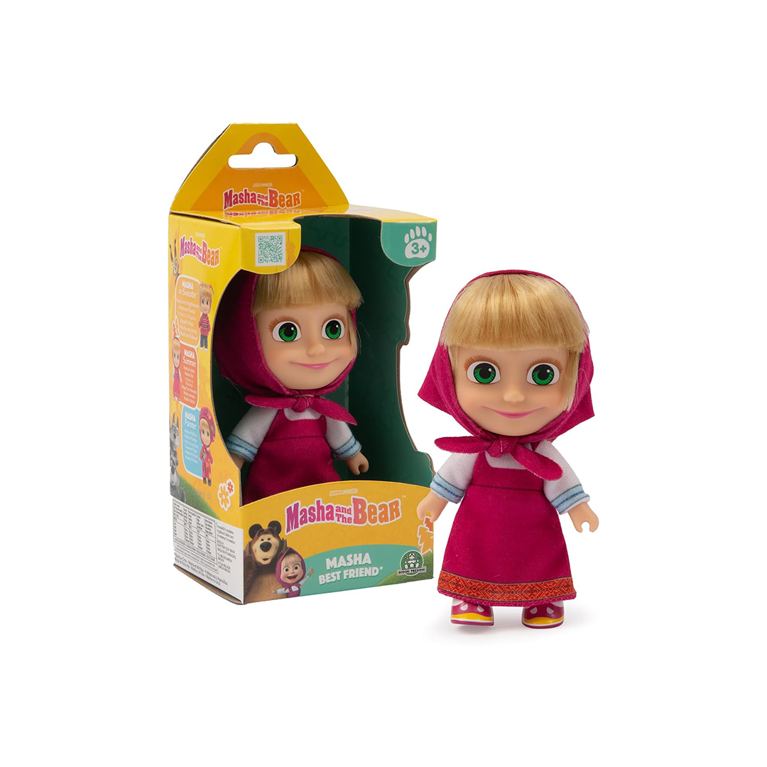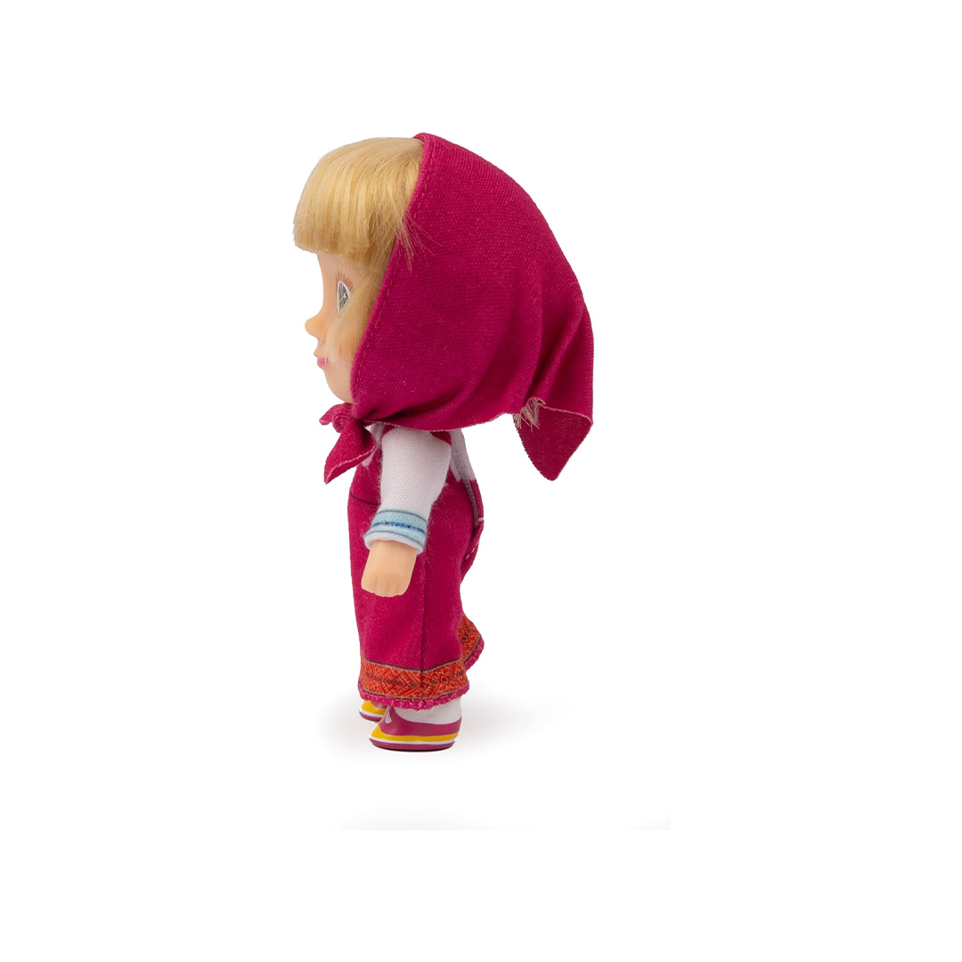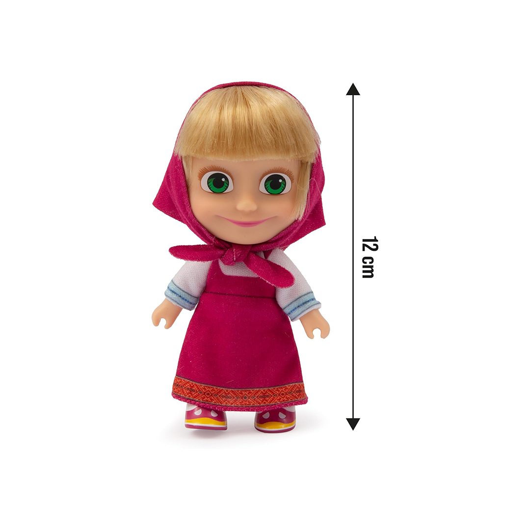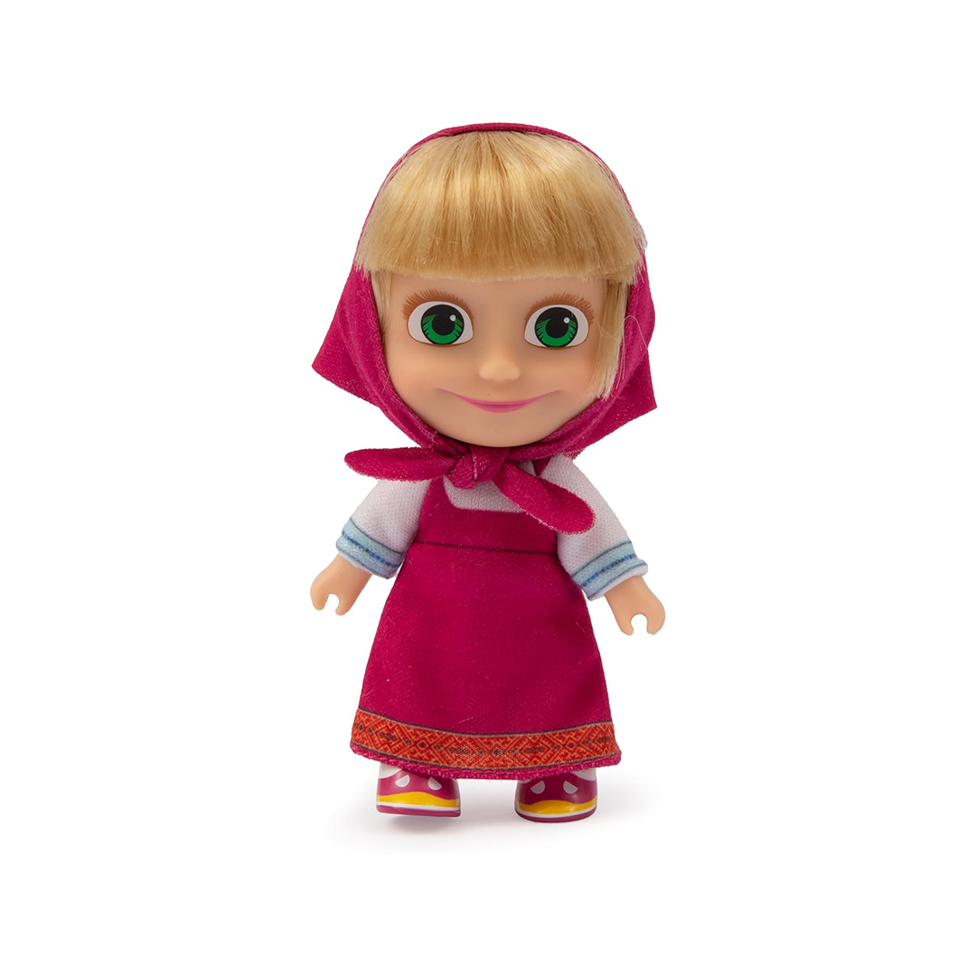 دمية ماشا – طولها 12 سم، ترتدي فستانًا صيفيًا أحمر مع وشاح مطابق من المسلسل التلفزيوني الشهير ماشا والدب – مناسبة للأطفال من سن 3 سنوات فما فوق