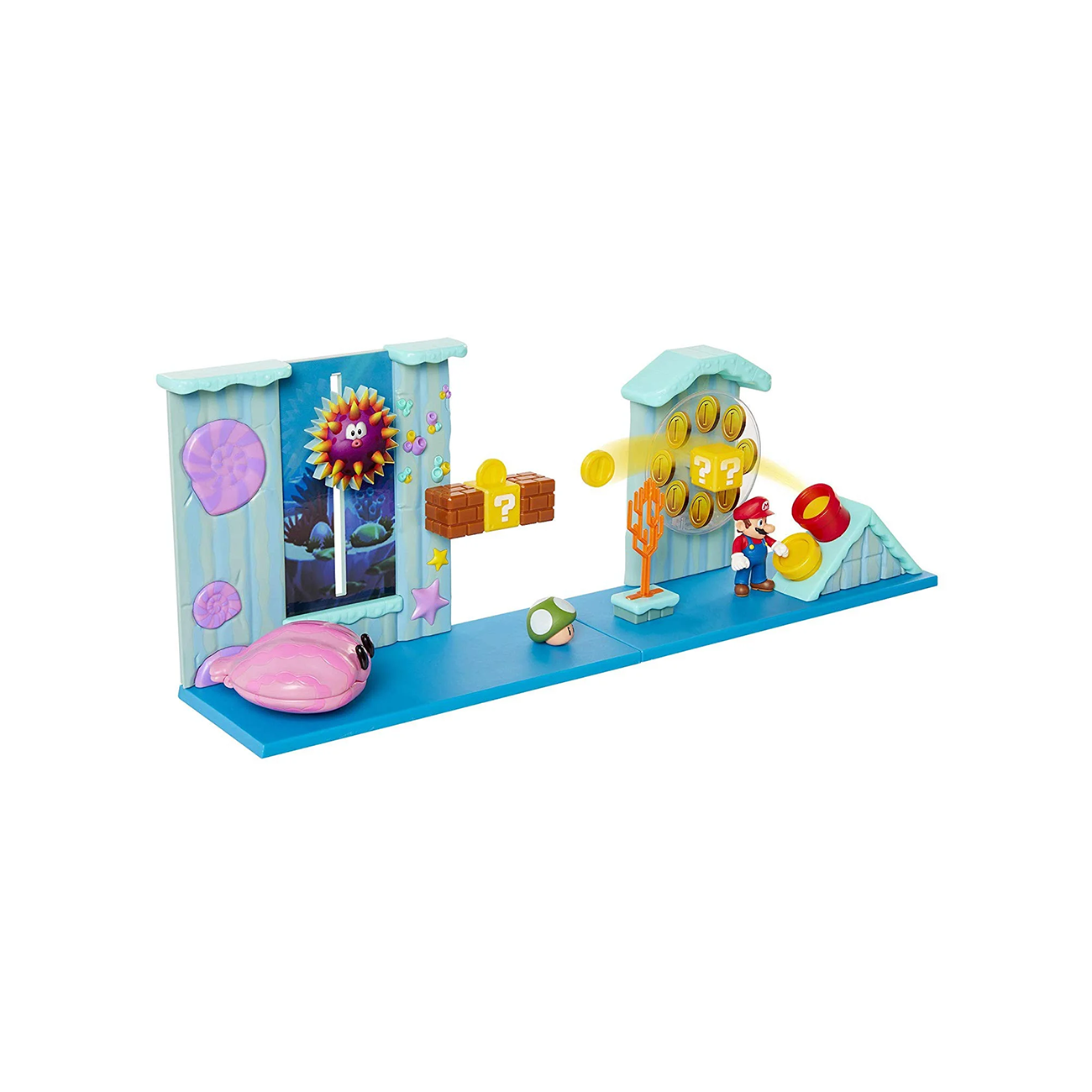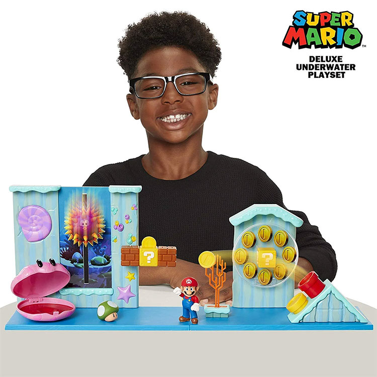انقل عالم ماريو برذرز الرائع إلى منزلك مع مجموعة ألعاب سوبر ماريو ديلوكس تحت الماء الرائعة، حيث ستنتقل من مغامر افتراضي إلى مغامر حقيقي، لساعات لا تُحصى من المرح. كن بطل مغامرتك الخاصة مع هذه المجموعة الرائعة، التي تتضمن شخصية سوبر ماريو مفصلية، وخمس قطع تفاعلية للبيئة، مثل مستكشف العملات المعدنية مع أنبوب قذف، وصدفة صدفية تفتح وتغلق، ومكعبات بها عملات معدنية مخفية، ومكعب أسئلة، ودوارة عملات معدنية، وقنفذ كبير يطفو. تتيح لك هذه المجموعة إعادة لعب هذا المستوى الكلاسيكي من لعبة عالم نينتندو تحت الماء. ابدأ ببناء عالمك الخاص، واجمع مجموعة رائعة.