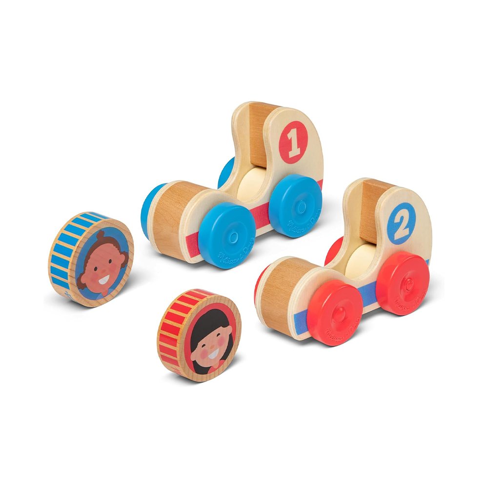 قم بلف ورص وإمساك اثنين من أصدقاء جو توتس الخشبيين على الوجهين واجعلهم يدورون في سيارتي سباق خشبيتين مرقمتين