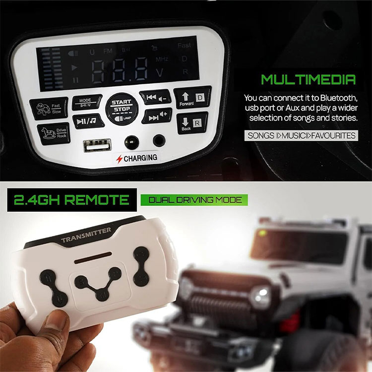 سيارة جيب للأطفال بتصميم قوي مستوحى من سيارات الطرق الوعرة، مزودة بعجلات كبيرة وأضواء أمامية وموسيقى ومقعد مريح. تعمل بالشحن وتمنح طفلك تجربة قيادة مليئة بالإثارة والمرح في الهواء الطلق.