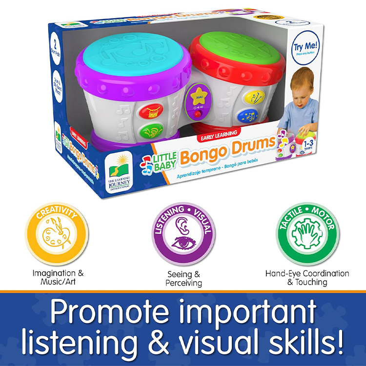 الميزات الرئيسية – تتميز طبول بونغو الصغيرة بأضواء نابضة بالحياة وأربعة أوضاع لعب لموسيقى عملية ممتعة. تشمل أوضاع اللعب: اللعب الحر، واللعب الحر، ووضع اللحن، ووضع الإيقاع. طبول بونغو الصغيرة هي لعبة تعليمية موسيقية آمنة ومثالية للأولاد والبنات الصغار من عمر ١٢ شهرًا فما فوق. المواصفات: لوحتا طبول، أربعة أزرار تفاعلية، أضواء ساطعة، ألحان مرحة، زر تشغيل/إيقاف/ضبط مستوى الصوت، وتصميم خفيف الوزن ومحمول. تتطلب ثلاث بطاريات AA (مرفقة).