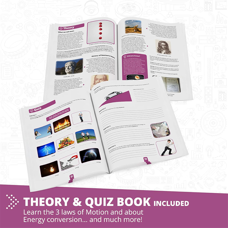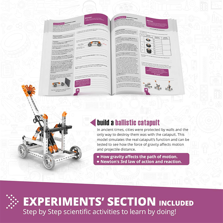 باستخدام هذه المجموعة ، يمكنهم بناء ثمانية نماذج عمل ، بما في ذلك منجنيق باليستي ، ومروحة جاذبية ، وسيارة تصادم ، وكابينة متحركة ، وطائرة تعمل بالبالون ، وسحب. بفضل تعليمات البناء سهلة المتابعة المقدمة إما عبر الإنترنت أو في الكتيب المتضمن ، يمكن للأطفال تجميع هذه النماذج بسرعة والشروع في رحلة تعليمية عملية. يقدم الكتيب تفسيرات تفصيلية للمبادئ العلمية المطبقة في كل نموذج ويتميز بأنشطة تجريبية مبتكرة تعزز التعلم التفاعلي.