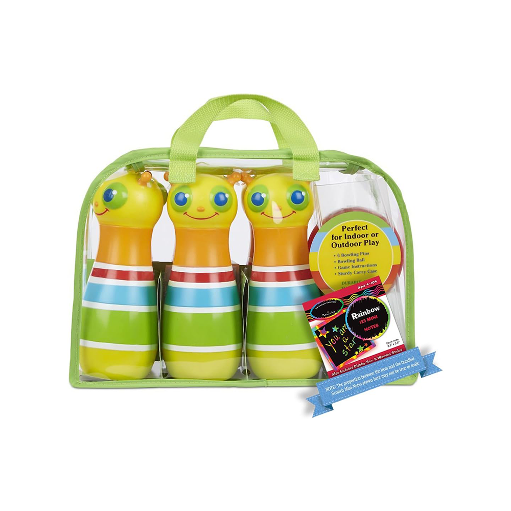 مجموعة Giddy Buggy للعب البولينج على العشب/الأرضية ذات الألوان الزاهية والملونة.تتضمن 6 دبابيس بولينج، وكرة بولينج سهلة الإمساك، وتعليمات اللعبة، وحقيبة حمل قويةيشجع التنسيق بين اليد والعين ومهارات العد الأولية.