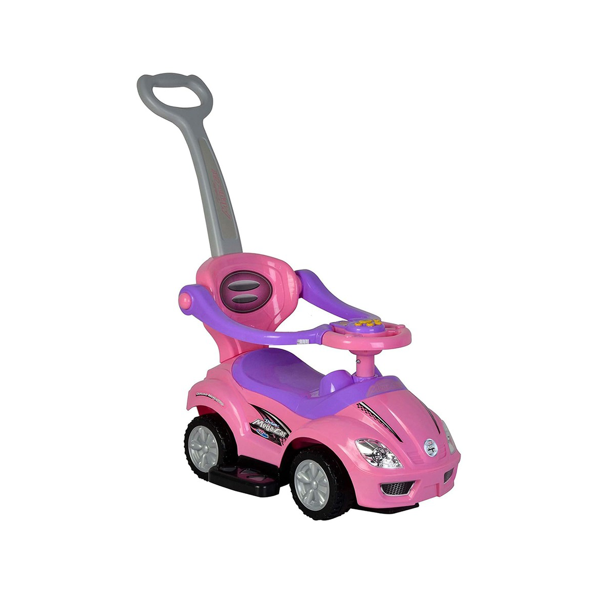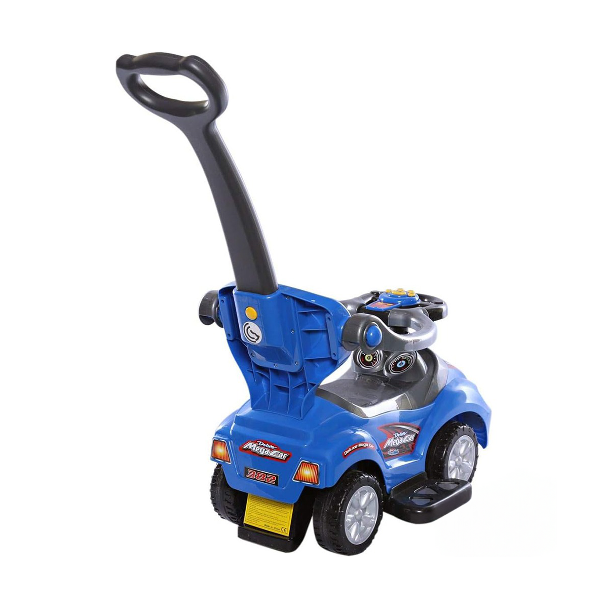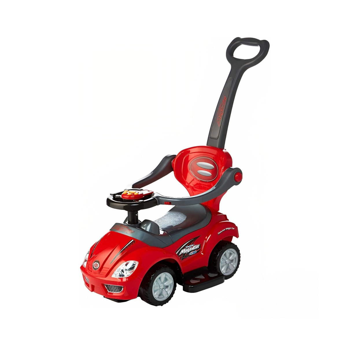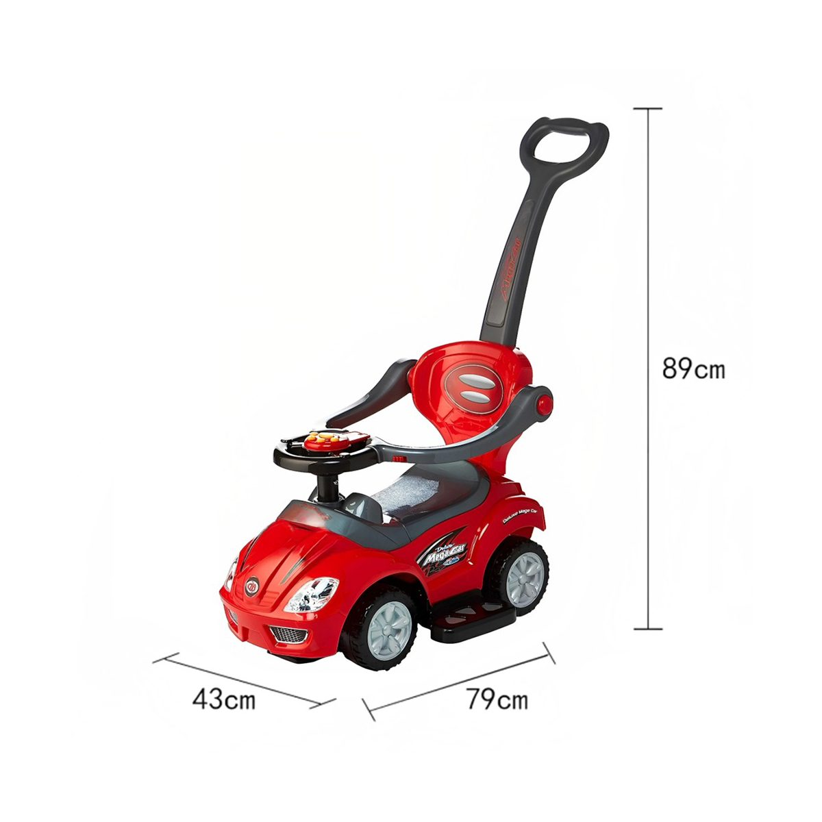 Push car with a stick. Children can use it themselves. Parents can also push them using the rear stick. Fixed backrest and footrest. Side guards prevent falls. Includes a toy box under the seat.
