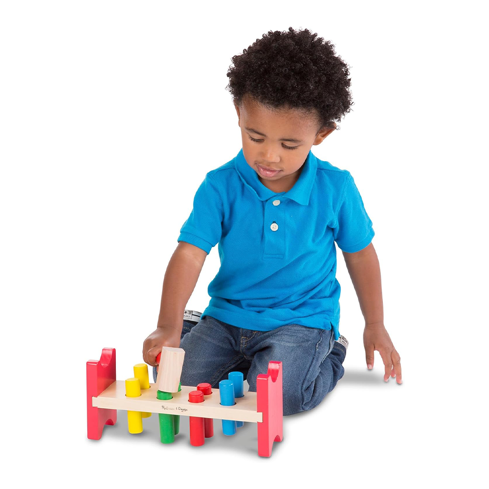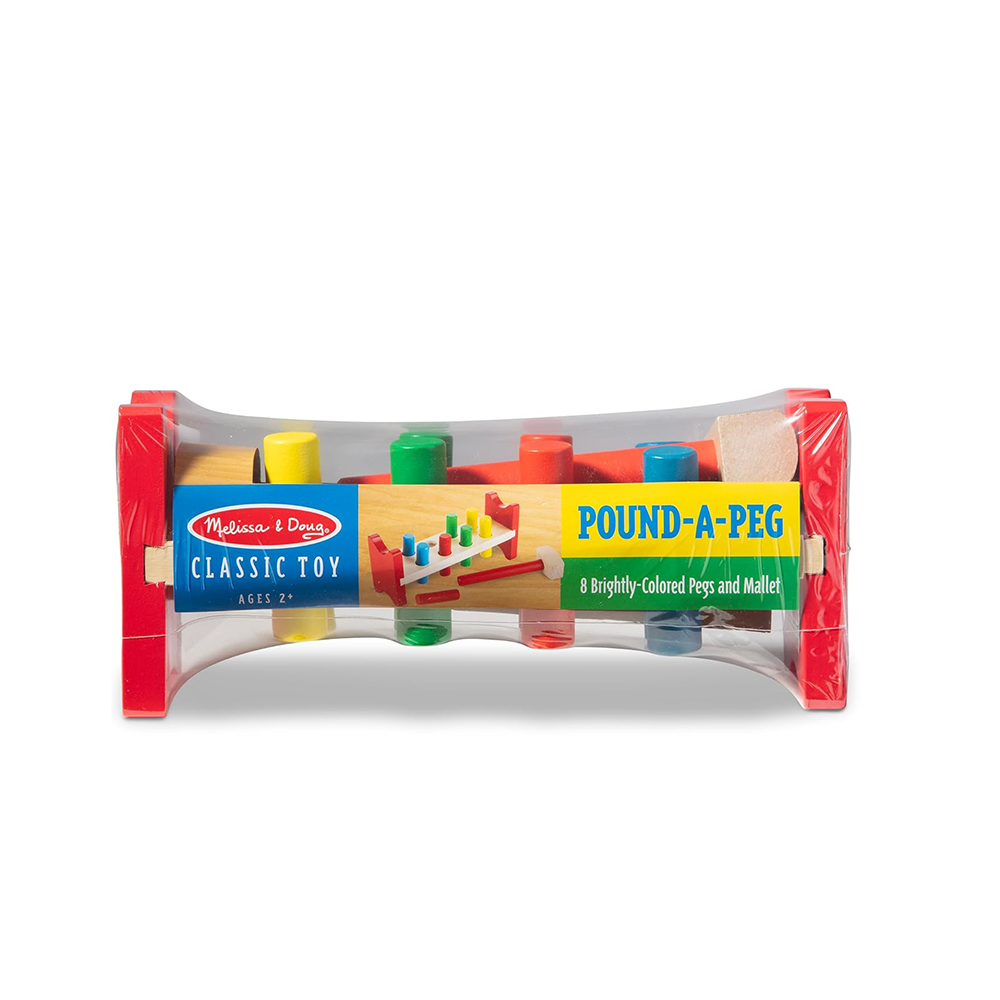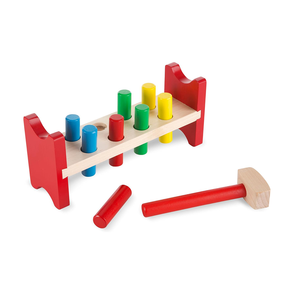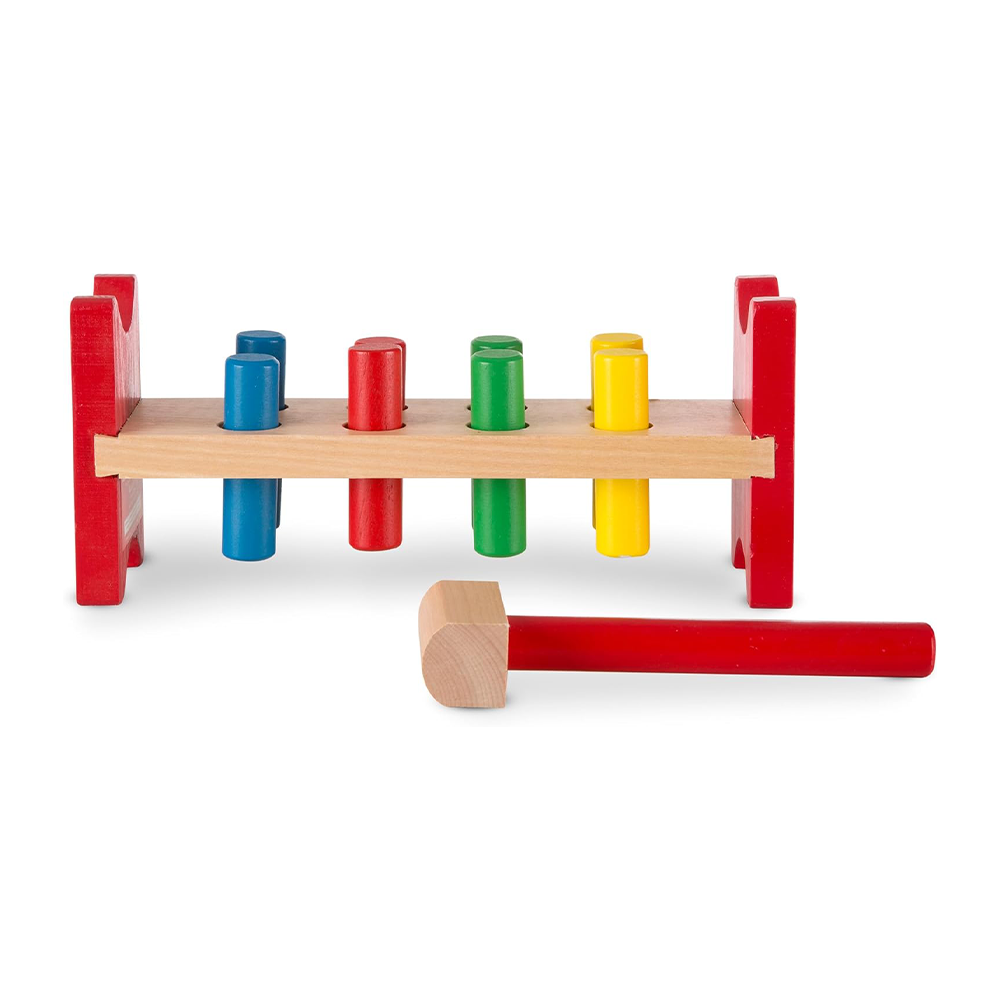 Have your child bang on the eight colorful wooden poles placed within a wooden frame and then lift them up to repeat the activity over and over again. Includes a wooden mallet and four pairs of adorable color-matching poles.