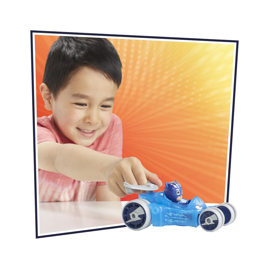It's time to be a hero! Preschoolers can speed to the rescue with the PJ Masks Animal Power Cat Car. The Cat Car is decorated with animal racing stripes to look like Catboy's King PJ Cat striped rider and comes with a movable Cat Boy figure in his riding outfit and racing helmet. The Cat Boy figure sits in the car's opening cockpit, and kids will love reenacting their favorite moments from the show with this action-ready toy. The figure works with Hasbro's Hero ID-equipped PJ Masks toys (each sold separately, subject to availability), which recognize and interact with compatible Hero ID PJ Masks figures using lights, sounds, or both. This Cat Boy car makes a fun gift for girls and boys ages 3 and up who love the nighttime adventures of Cat Boy, Owlette, and Gekko.