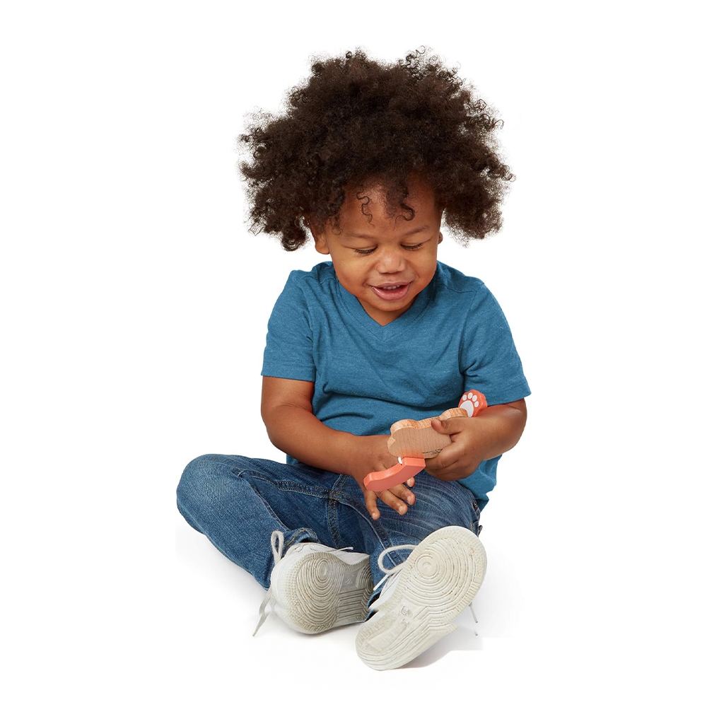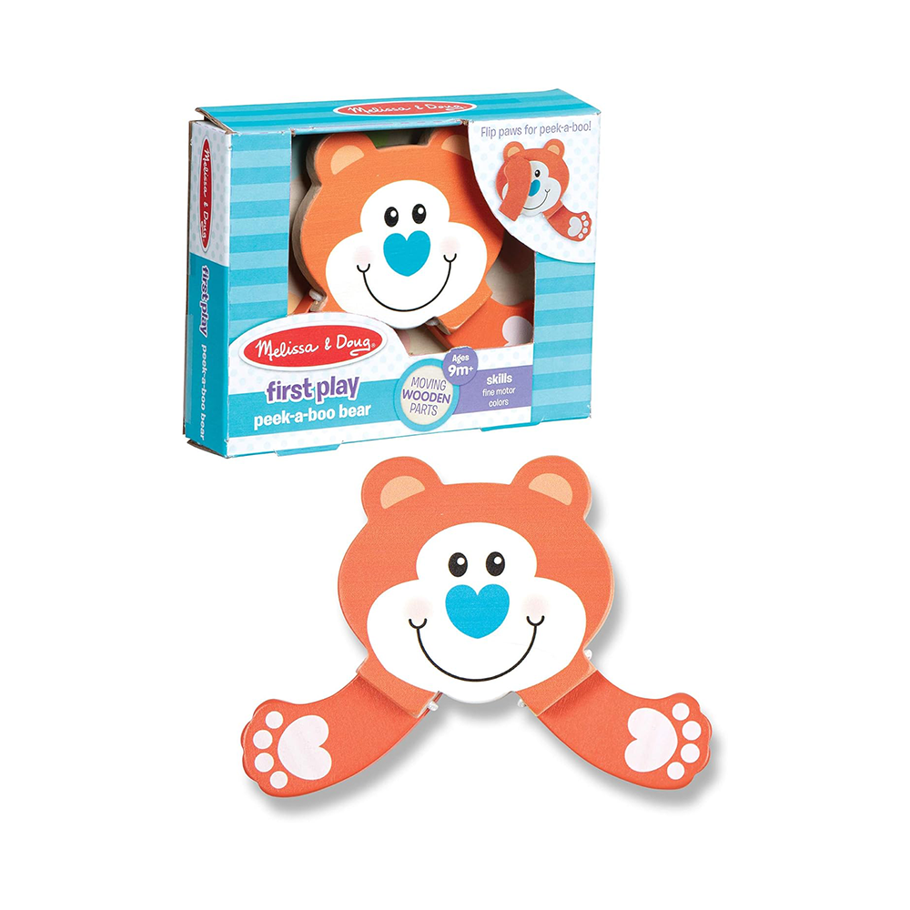 Kids will love playing peek-a-boo with this adorable wooden bear toy. Lift the soft, hinged paws to reveal the bear's friendly, smiling face; make a satisfying "clap" when the paws are placed on the bear's face. Great for promoting early developmental skills, such as color recognition and fine motor skills. Bright colors, bold patterns, and whimsical designs enhance skills while sparking imagination and wonder. A great gift for children ages 12-24 months, for hands-on, screen-free fun.