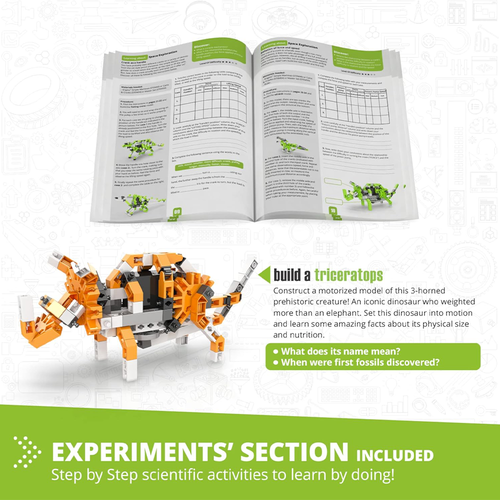 Children learn all about dinosaurs and how they lived on Earth during the prehistoric era. Build 5 motorized dinosaur models, including the Brontosaurus, Stegosaurus, Triceratops, and more.