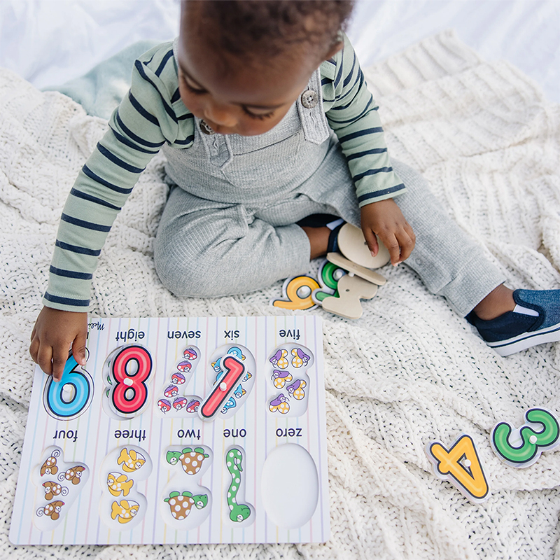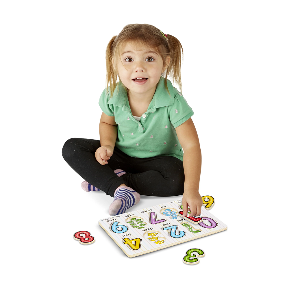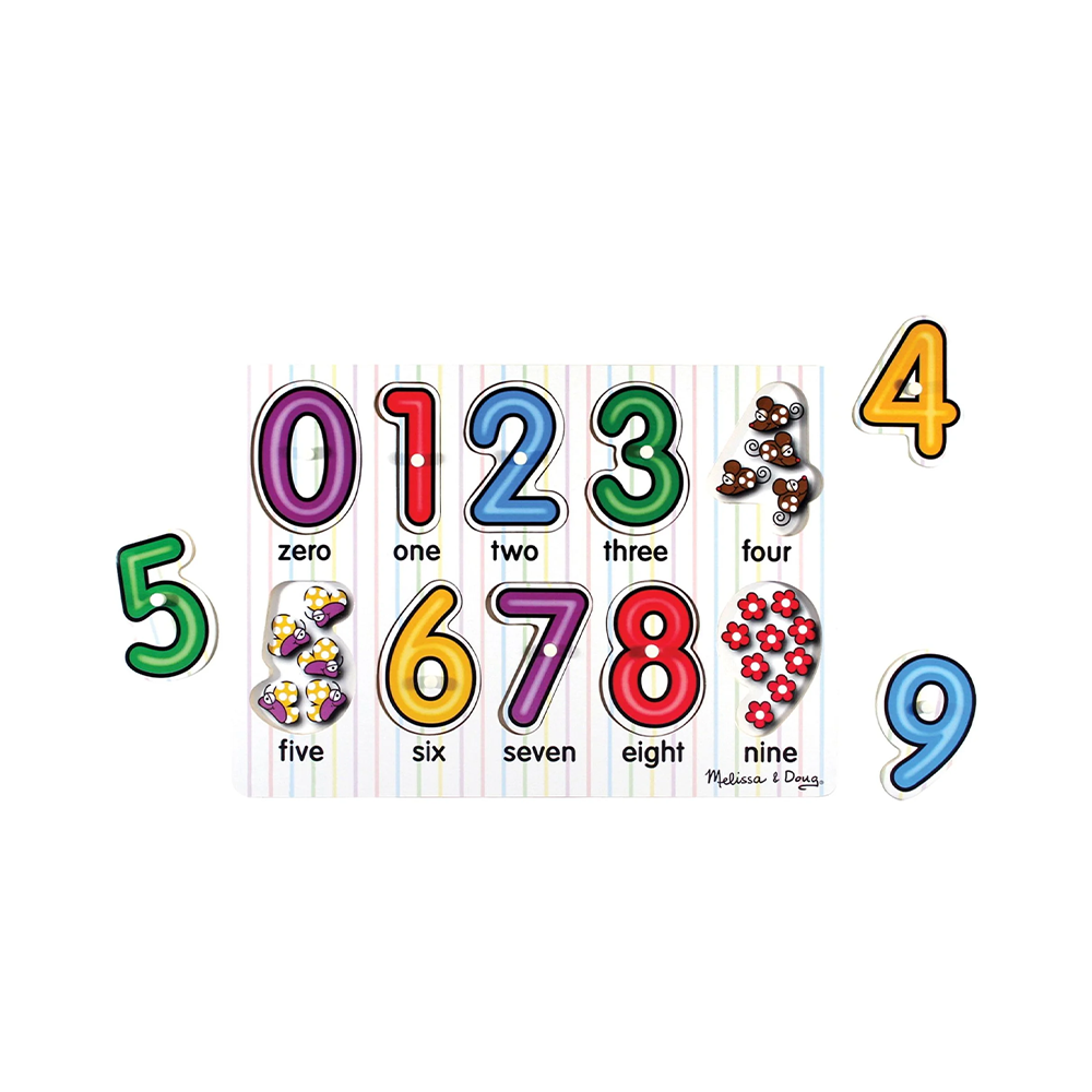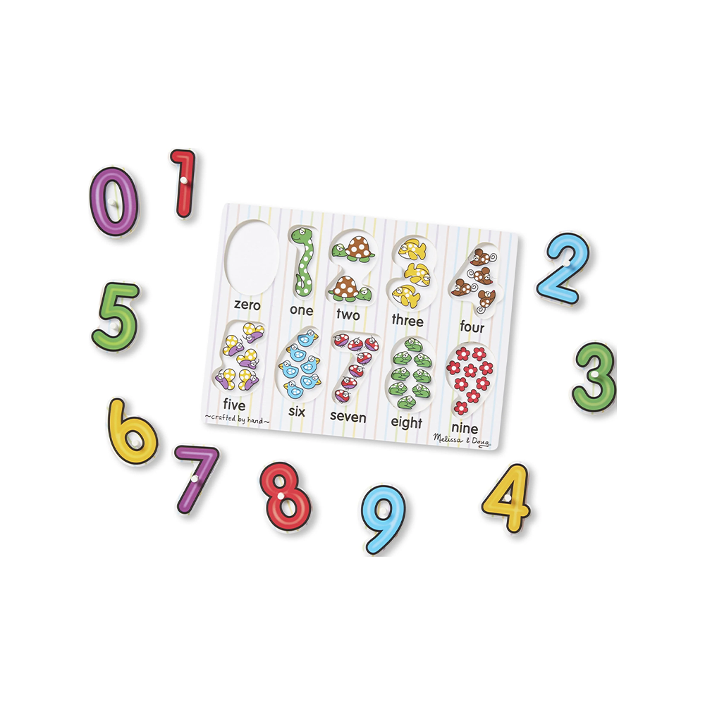 Number concepts, from zero to nine, are illustrated in this 10-piece puzzle. A colorful image at the bottom of each piece shows the same number of items as the one at the top, helping to reinforce number recognition and counting skills! It encourages hand-eye skills, fine motor skills, and visual perception. This product is Forest Stewardship Council (FSC) certified. FSC certification ensures that products are produced from responsibly managed forests, providing environmental, social, and economic benefits, and that the forests are protected for future generations.