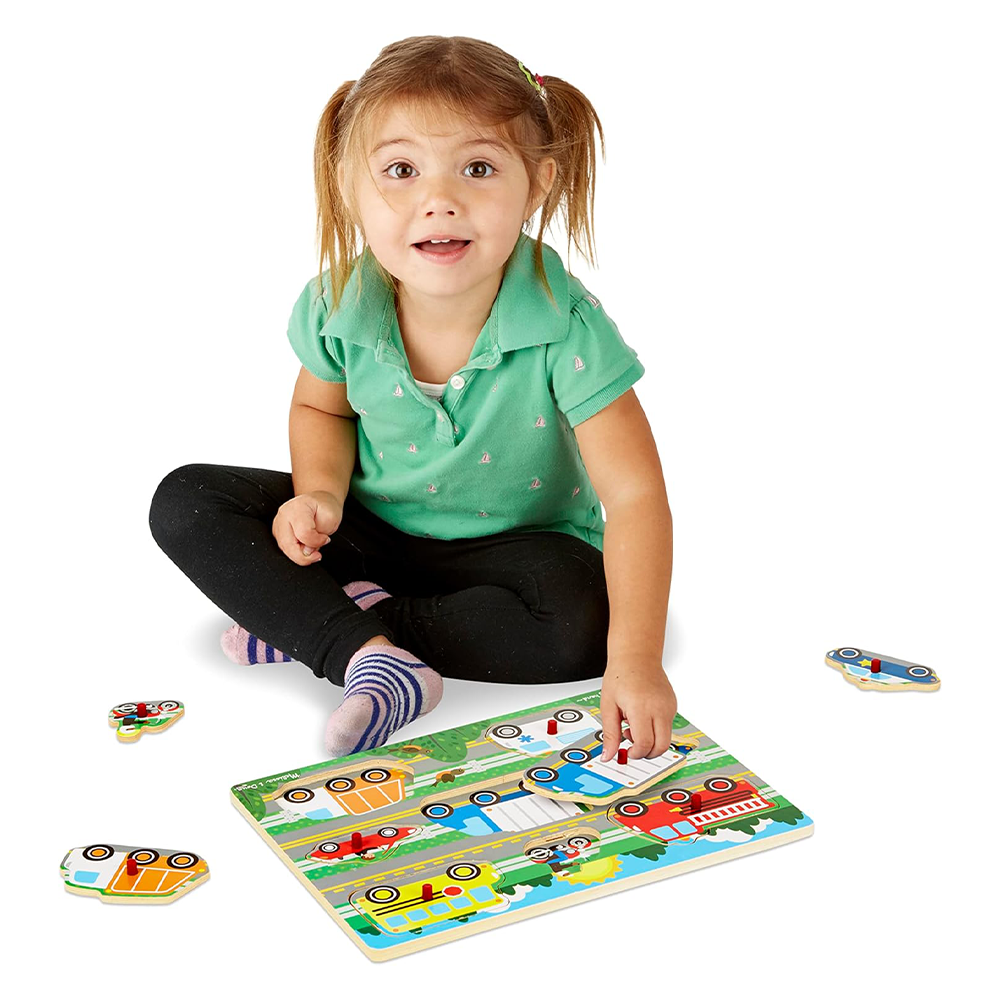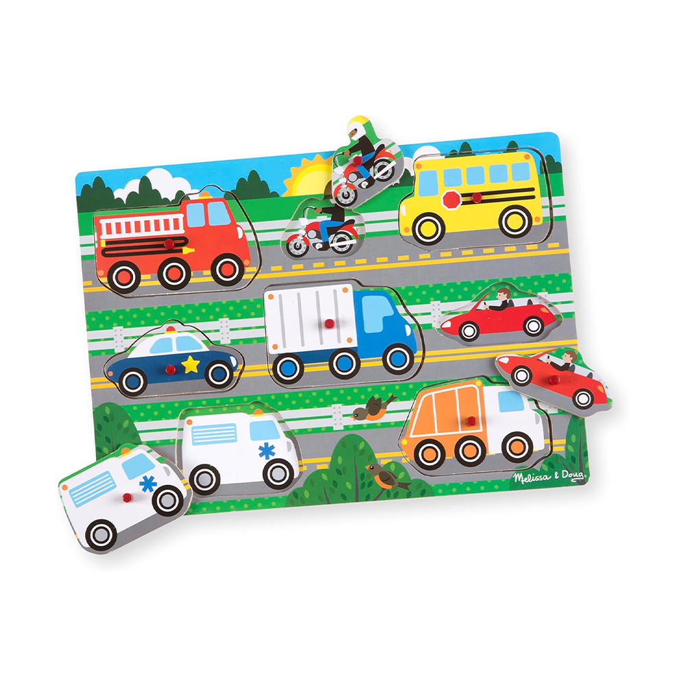 Drive your favorite car with this colorful 8-piece wooden peg puzzle! The bright colors attract children's attention, and the pictures under the pieces and easy-to-grasp pegs help solve the puzzle.